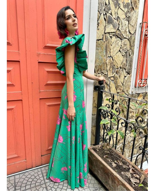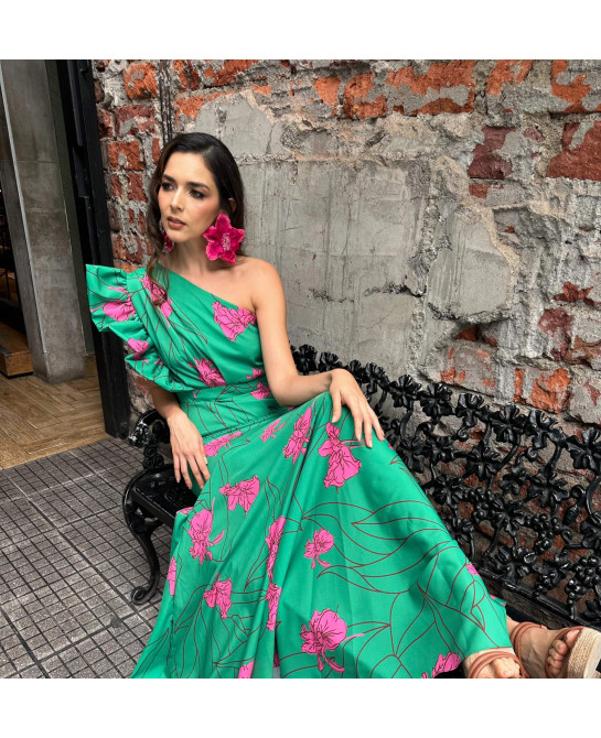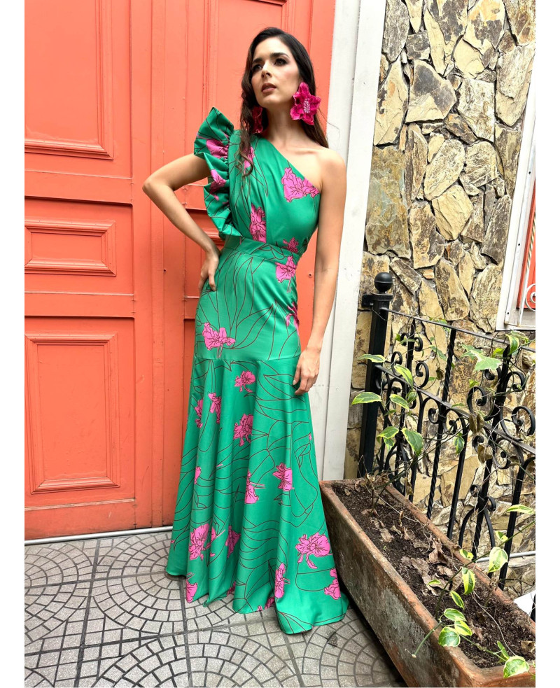 Conviértete en la Invitada Perfecta con nuestro icónico vestido Zoe. Este fabuloso vestido presenta un delicado estampado floral en colores vibrantes con un atractivo escote abierto asimétrico con románticos boleros en su manga. Su falda impecable y toque refinado la convierten en una pieza ideal para cualquier ocasión.