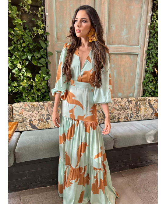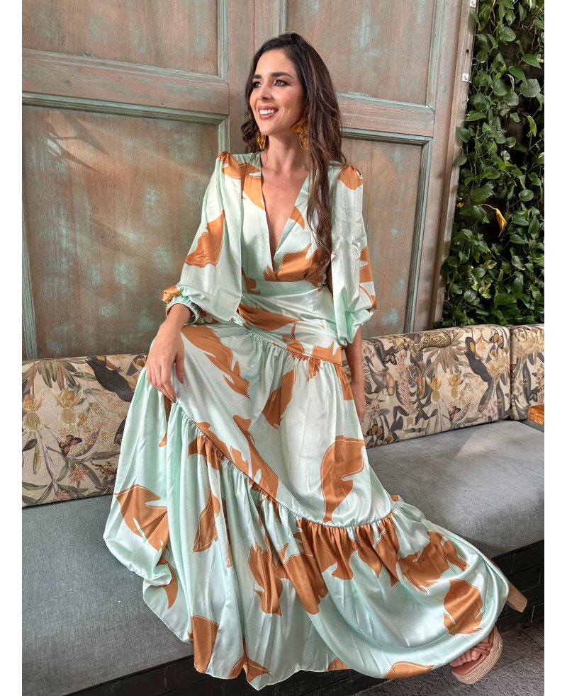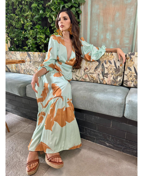 Luce elegante y sin esfuerzo. Vestido cuello en V, corte de cintura semi-alta y falda larga en cortes con fruncido. Nos encanta crear diseños que estilicen tu silueta.